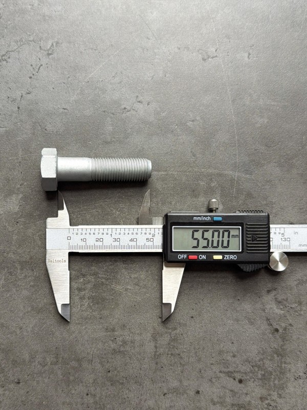 Болт с шестигранной головкой, высокопрочный, мелкий шаг резьбы. Болт российского производства. Заводской номер: 00001-0059883-319. Стандарт: таблица FIAT-ВАЗ 10312. Диаметр резьбы: 20 мм. Шаг резьбы: 1,5. Длина болта: 60 мм. Длина резьбы: 46 мм. Размер "под ключ": 30 мм. Класс прочности: 10.9. Покрытие: цинк. В соответствии со стандартами, длина болта измеряется от опорной части головки до конца фаски, которой завершается его резьбовой стержень.